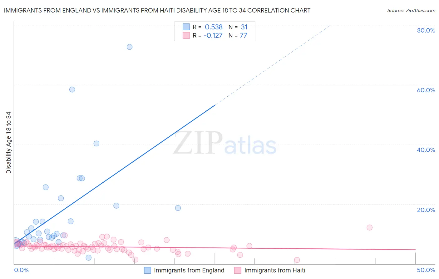 Immigrants from England vs Immigrants from Haiti Disability Age 18 to 34 Correlation Chart