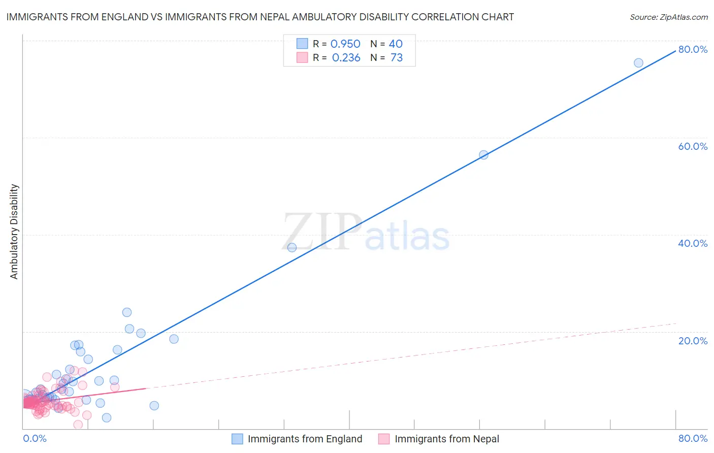 Immigrants from England vs Immigrants from Nepal Ambulatory Disability Correlation Chart