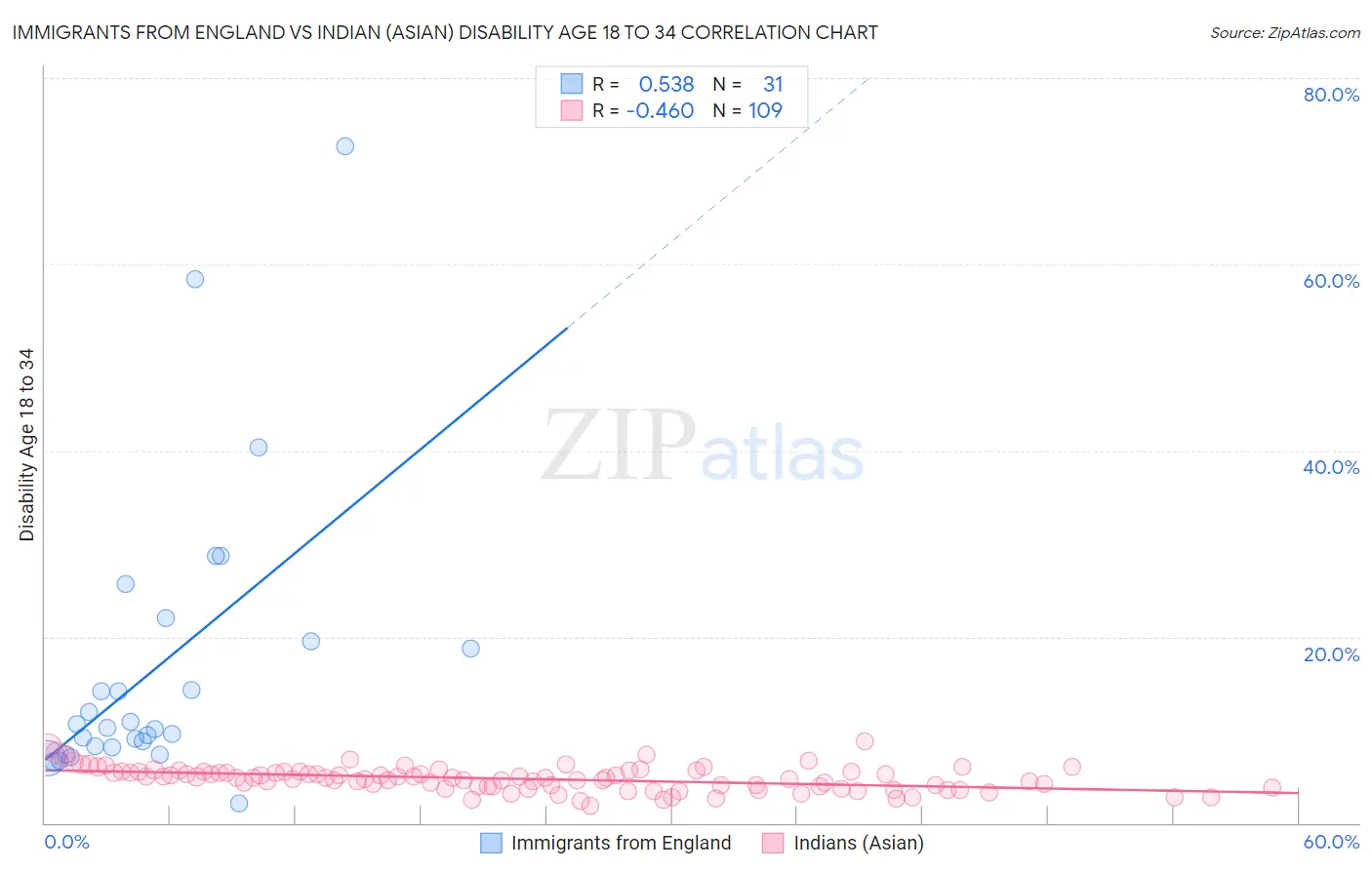Immigrants from England vs Indian (Asian) Disability Age 18 to 34 Correlation Chart