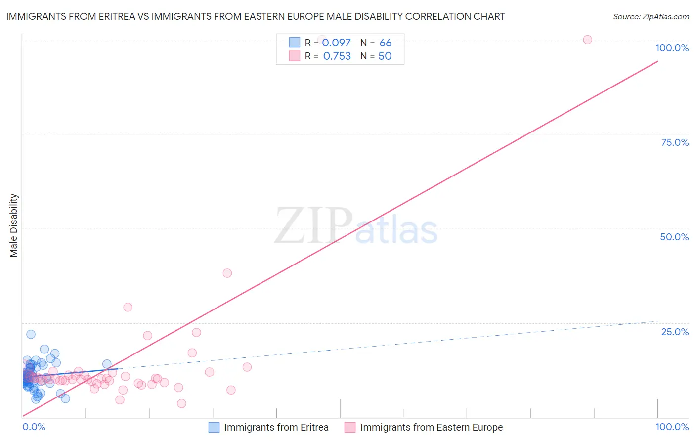 Immigrants from Eritrea vs Immigrants from Eastern Europe Male Disability Correlation Chart