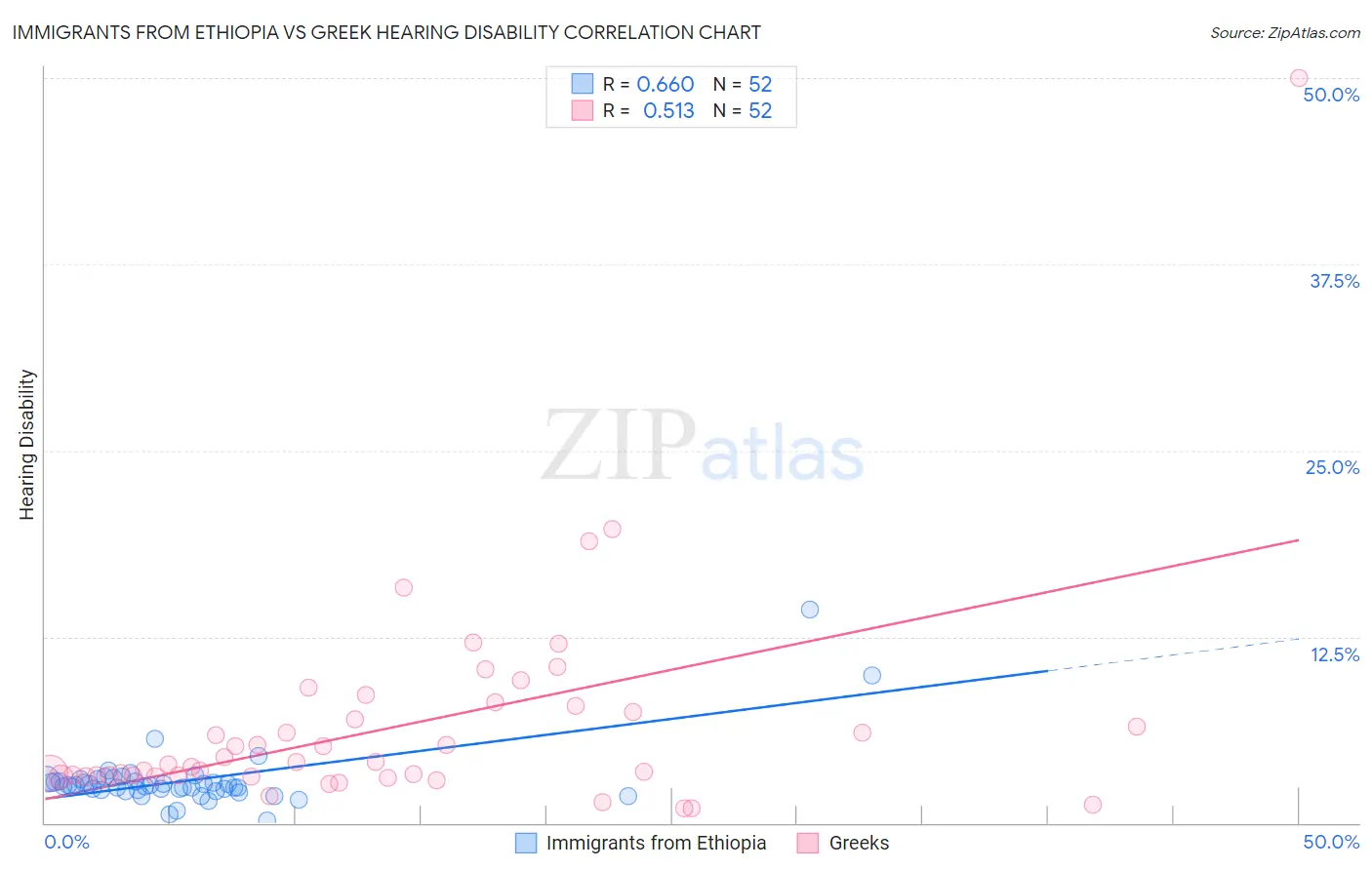 Immigrants from Ethiopia vs Greek Hearing Disability Correlation Chart