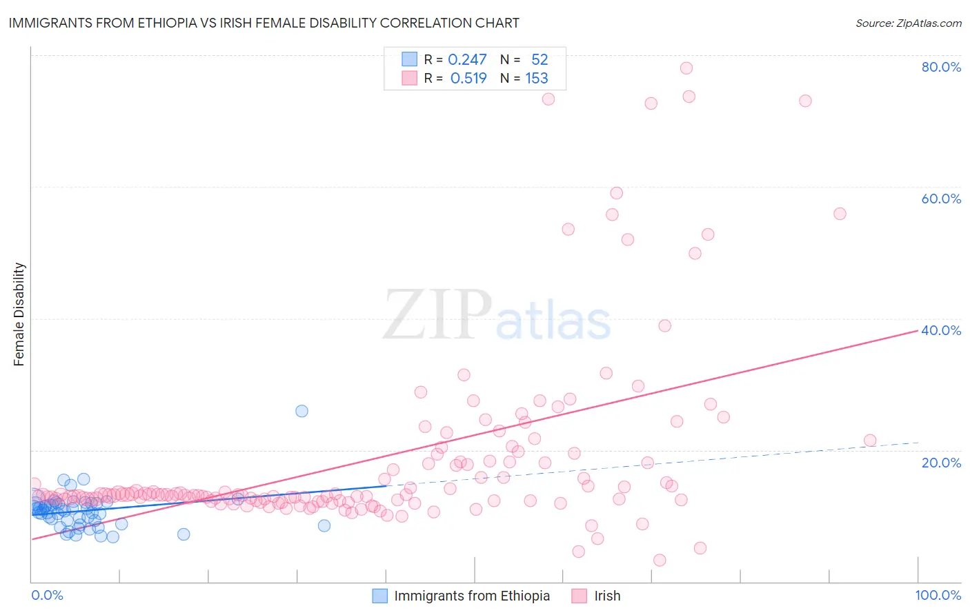 Immigrants from Ethiopia vs Irish Female Disability Correlation Chart