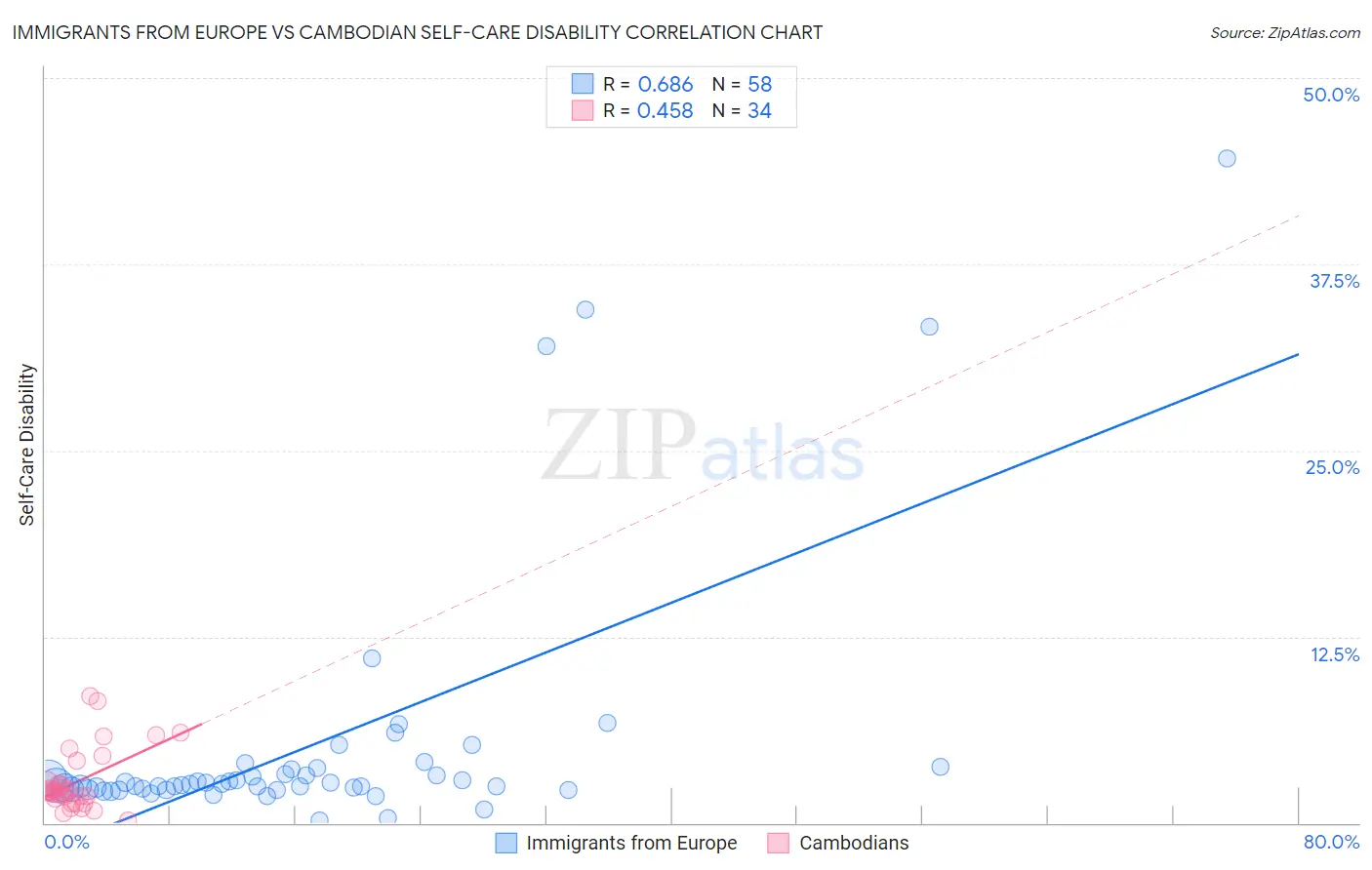 Immigrants from Europe vs Cambodian Self-Care Disability Correlation Chart