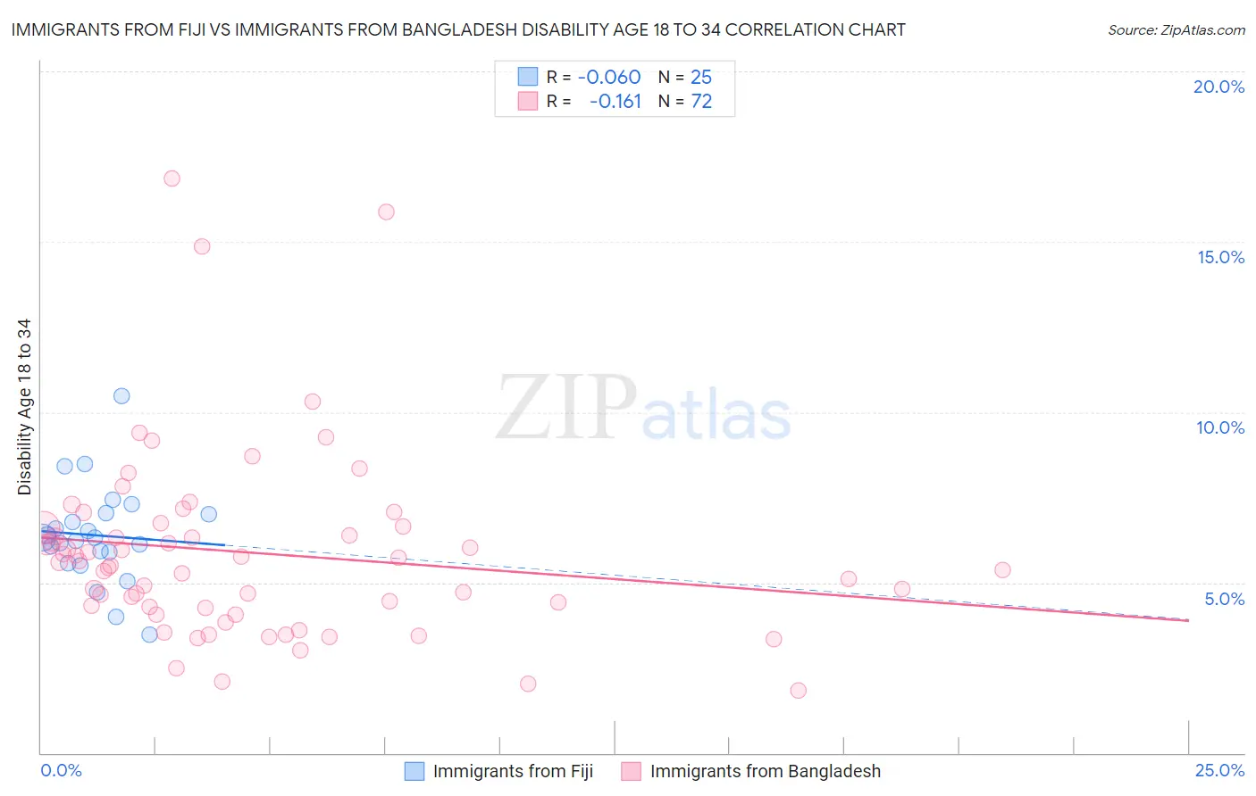 Immigrants from Fiji vs Immigrants from Bangladesh Disability Age 18 to 34 Correlation Chart