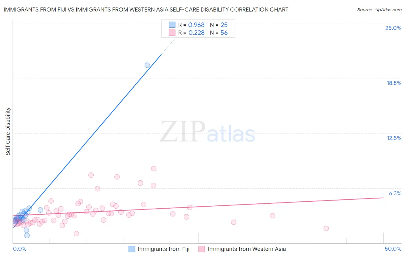 Immigrants from Fiji vs Immigrants from Western Asia Self-Care Disability Correlation Chart