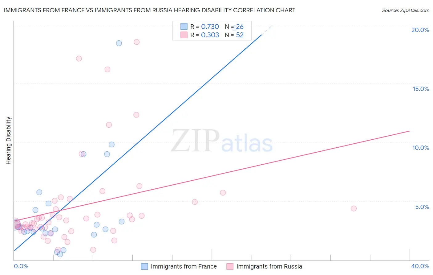 Immigrants from France vs Immigrants from Russia Hearing Disability Correlation Chart