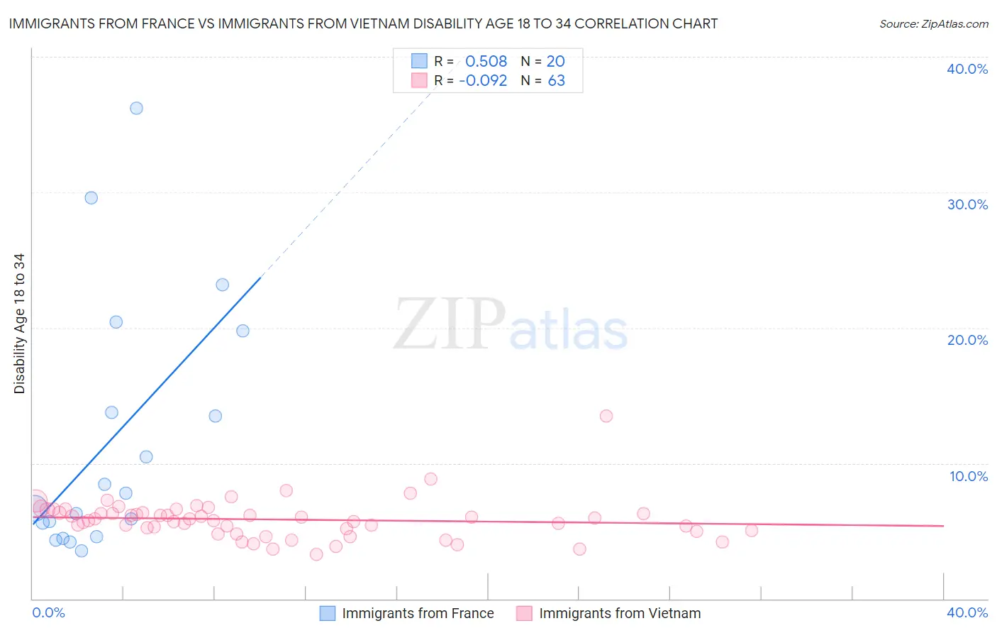 Immigrants from France vs Immigrants from Vietnam Disability Age 18 to 34 Correlation Chart