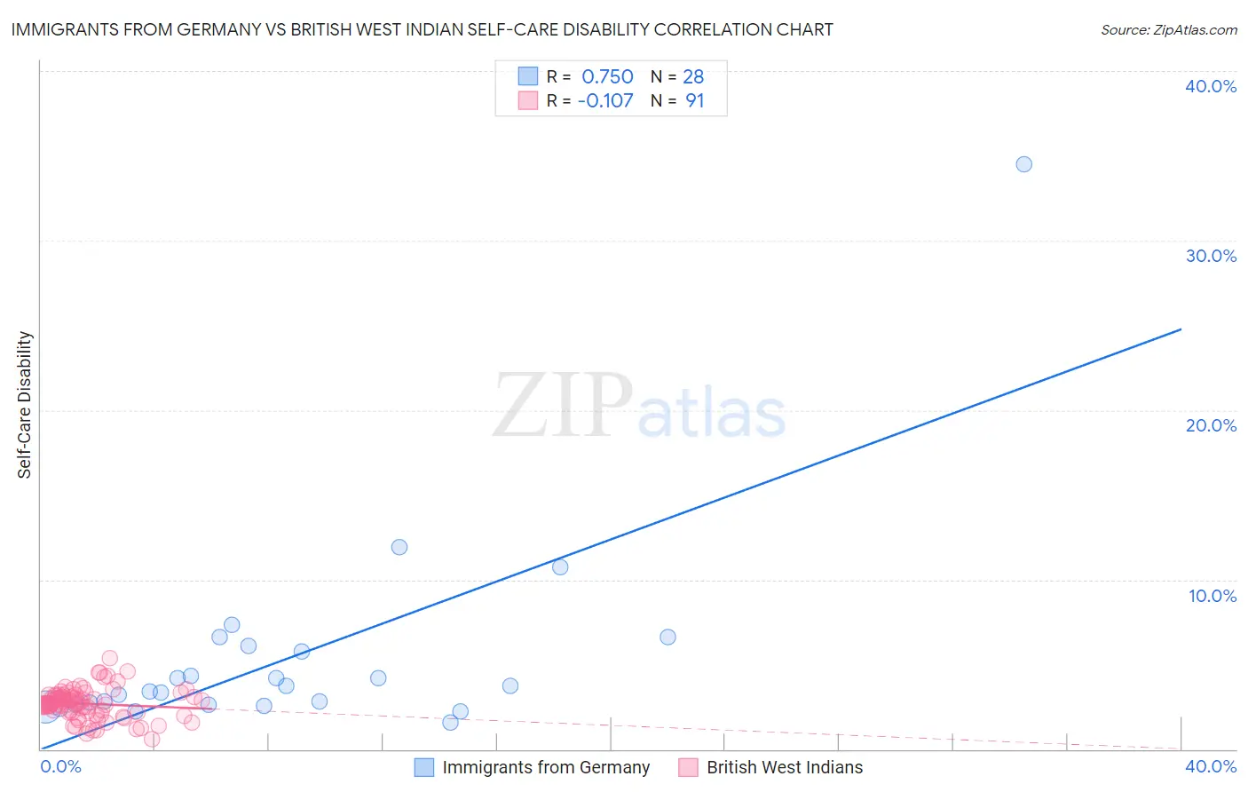 Immigrants from Germany vs British West Indian Self-Care Disability Correlation Chart