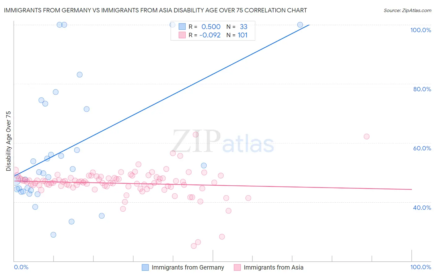 Immigrants from Germany vs Immigrants from Asia Disability Age Over 75 Correlation Chart