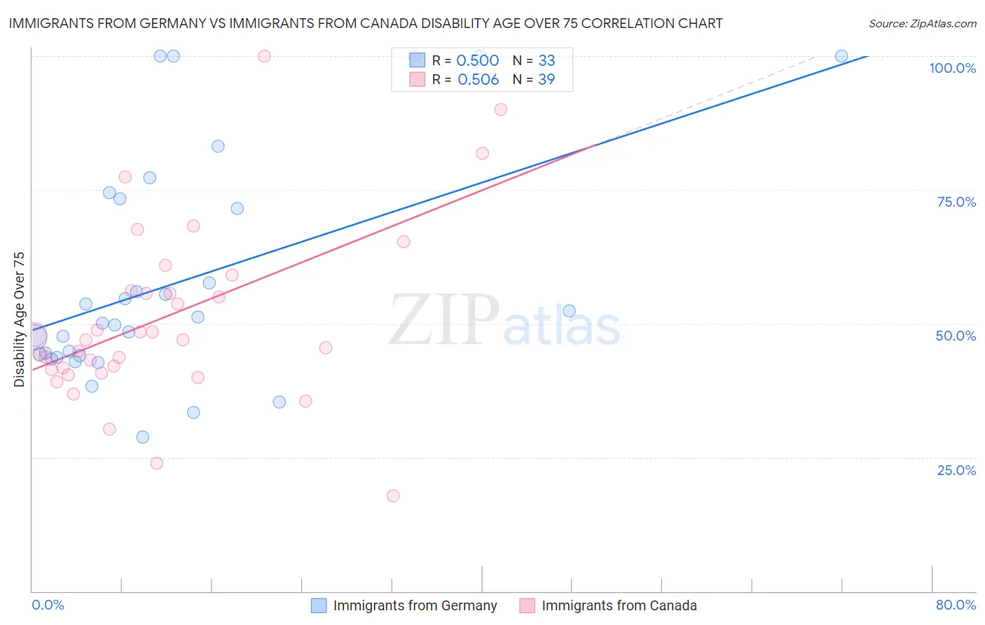 Immigrants from Germany vs Immigrants from Canada Disability Age Over 75 Correlation Chart
