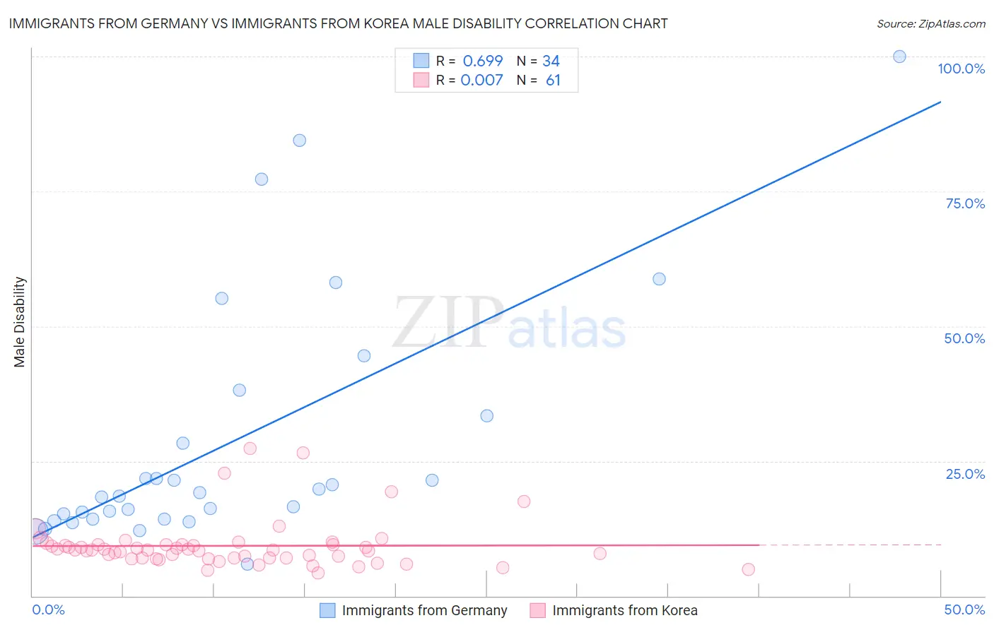 Immigrants from Germany vs Immigrants from Korea Male Disability Correlation Chart