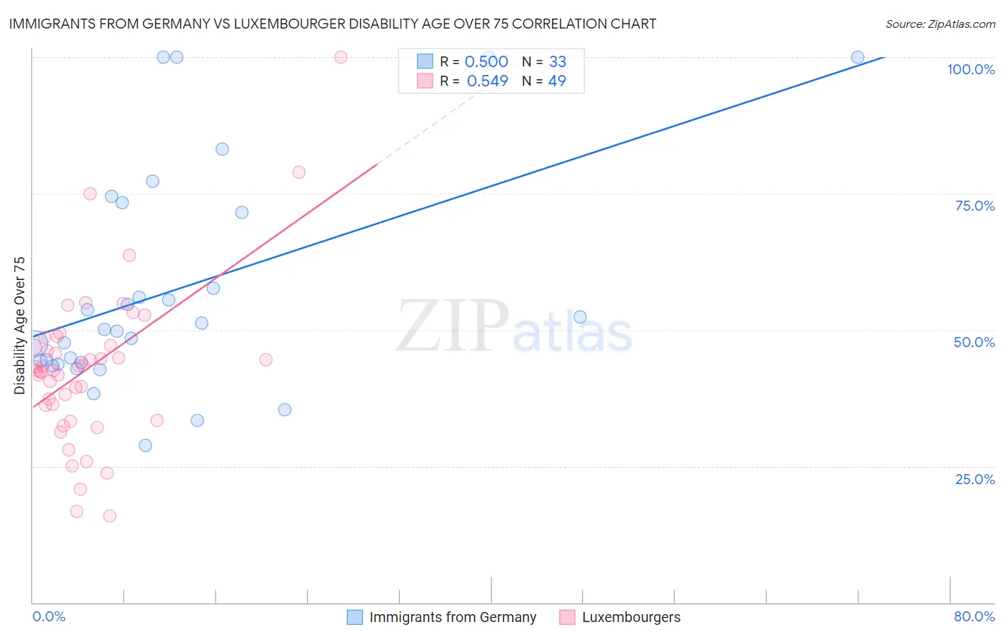 Immigrants from Germany vs Luxembourger Disability Age Over 75 Correlation Chart
