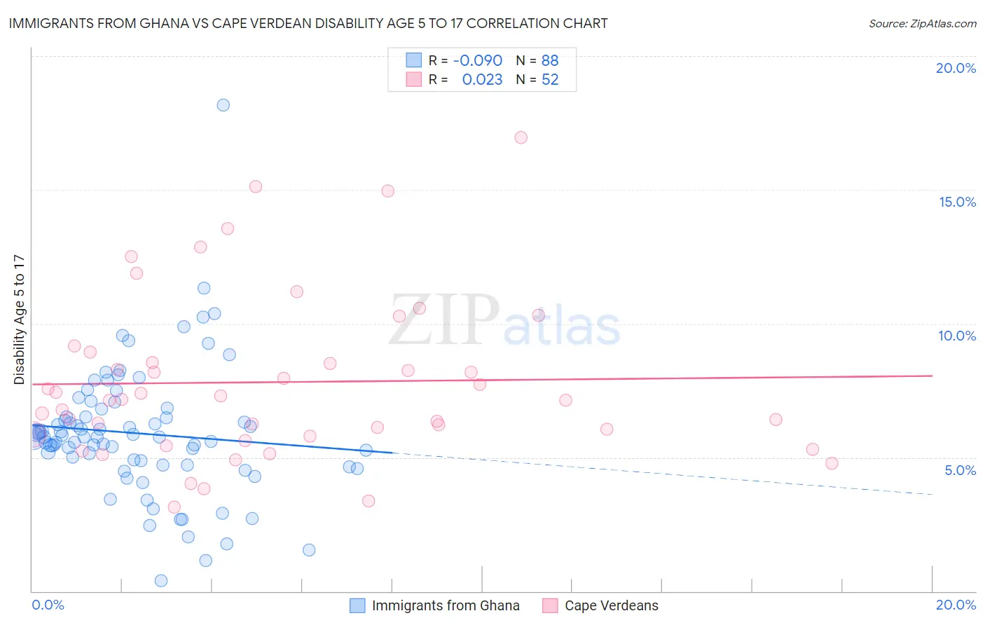 Immigrants from Ghana vs Cape Verdean Disability Age 5 to 17 Correlation Chart