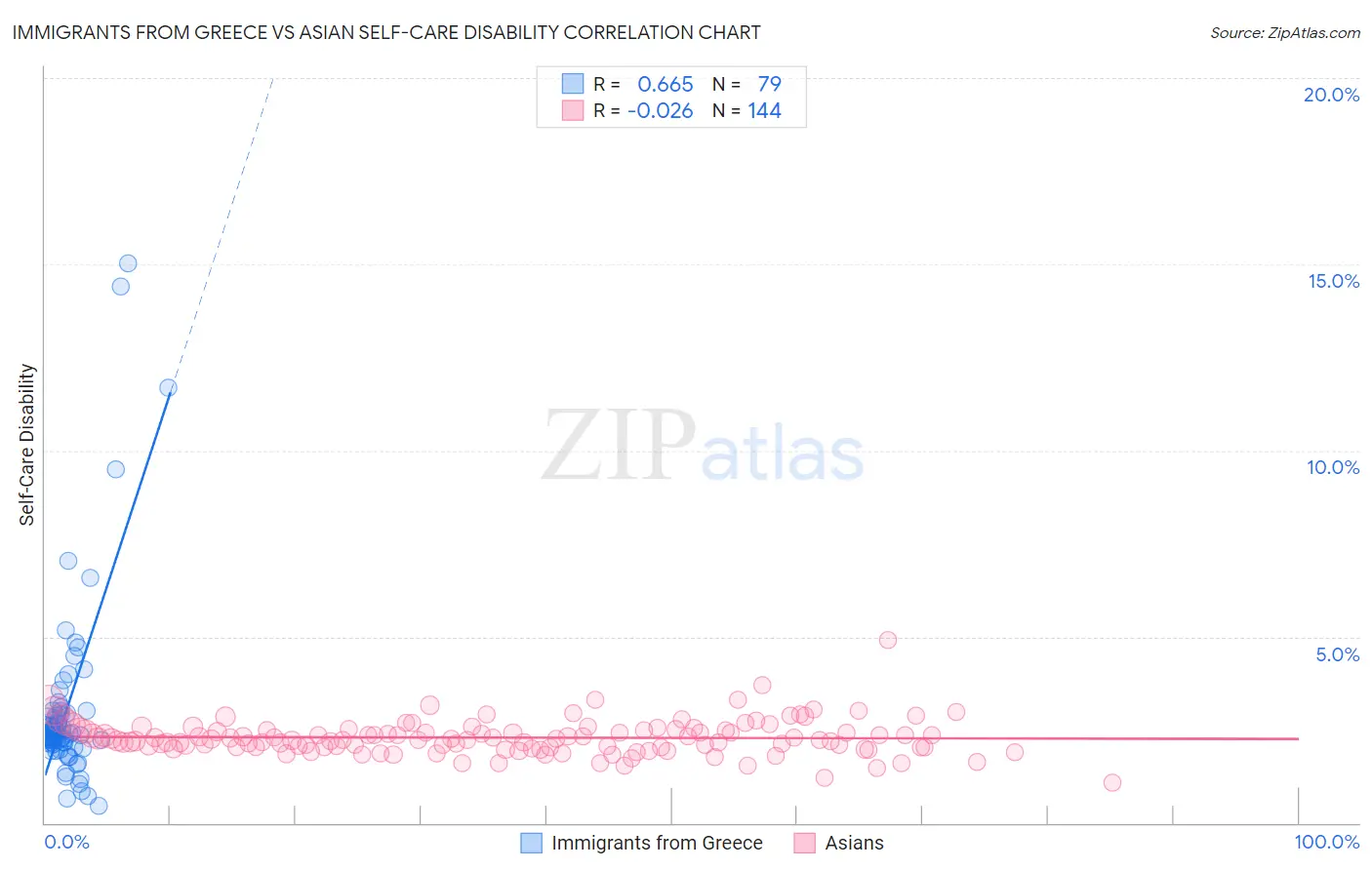 Immigrants from Greece vs Asian Self-Care Disability Correlation Chart