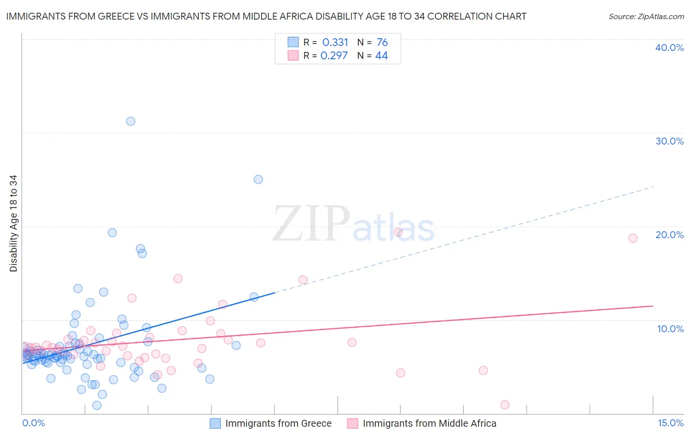 Immigrants from Greece vs Immigrants from Middle Africa Disability Age 18 to 34 Correlation Chart