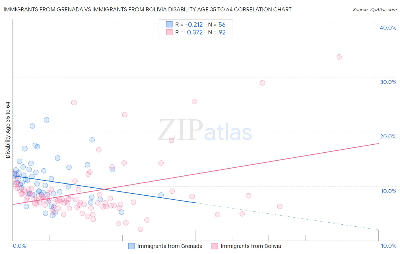 Immigrants from Grenada vs Immigrants from Bolivia Disability Age 35 to 64 Correlation Chart