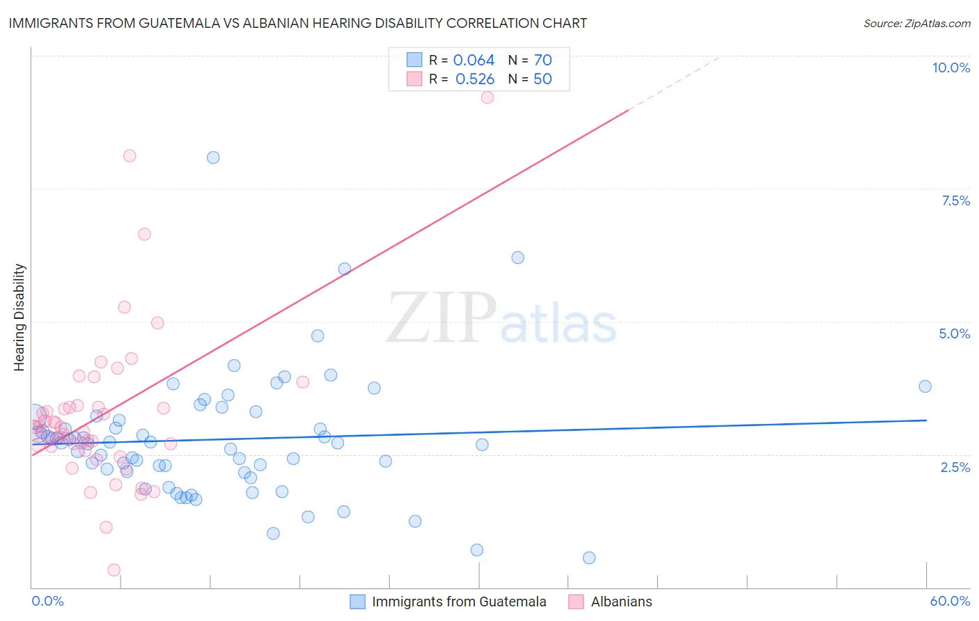 Immigrants from Guatemala vs Albanian Hearing Disability Correlation Chart