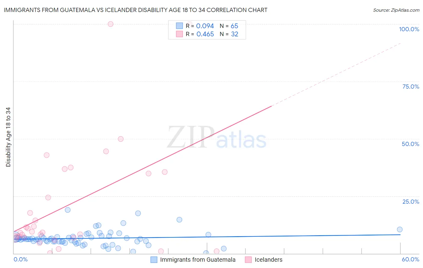 Immigrants from Guatemala vs Icelander Disability Age 18 to 34 Correlation Chart