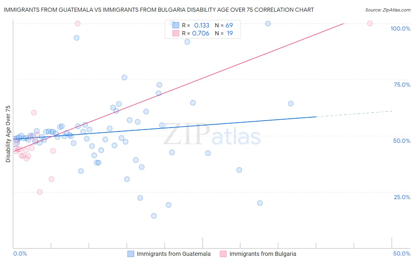 Immigrants from Guatemala vs Immigrants from Bulgaria Disability Age Over 75 Correlation Chart