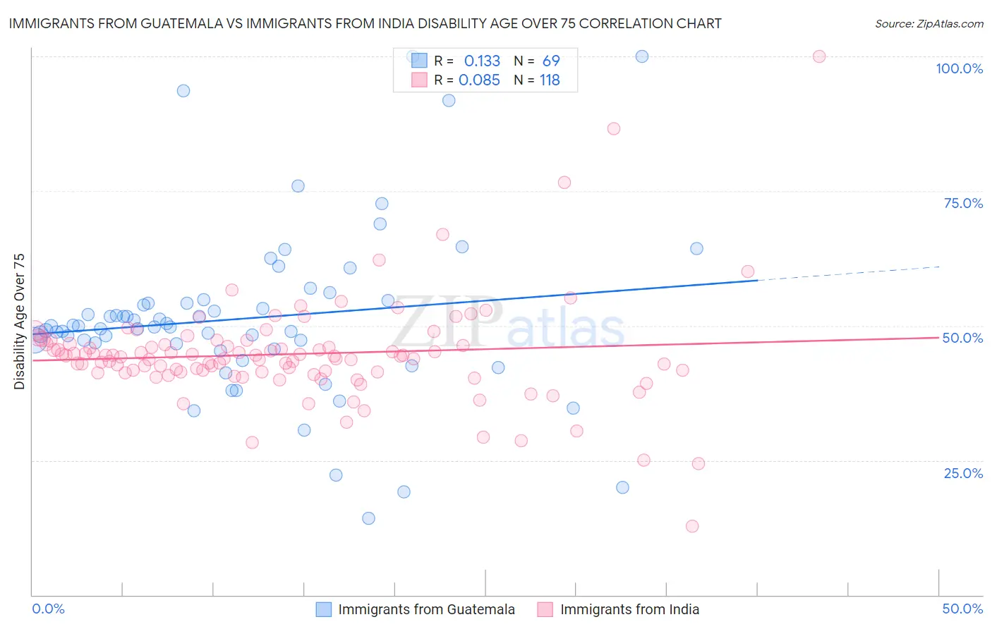 Immigrants from Guatemala vs Immigrants from India Disability Age Over 75 Correlation Chart