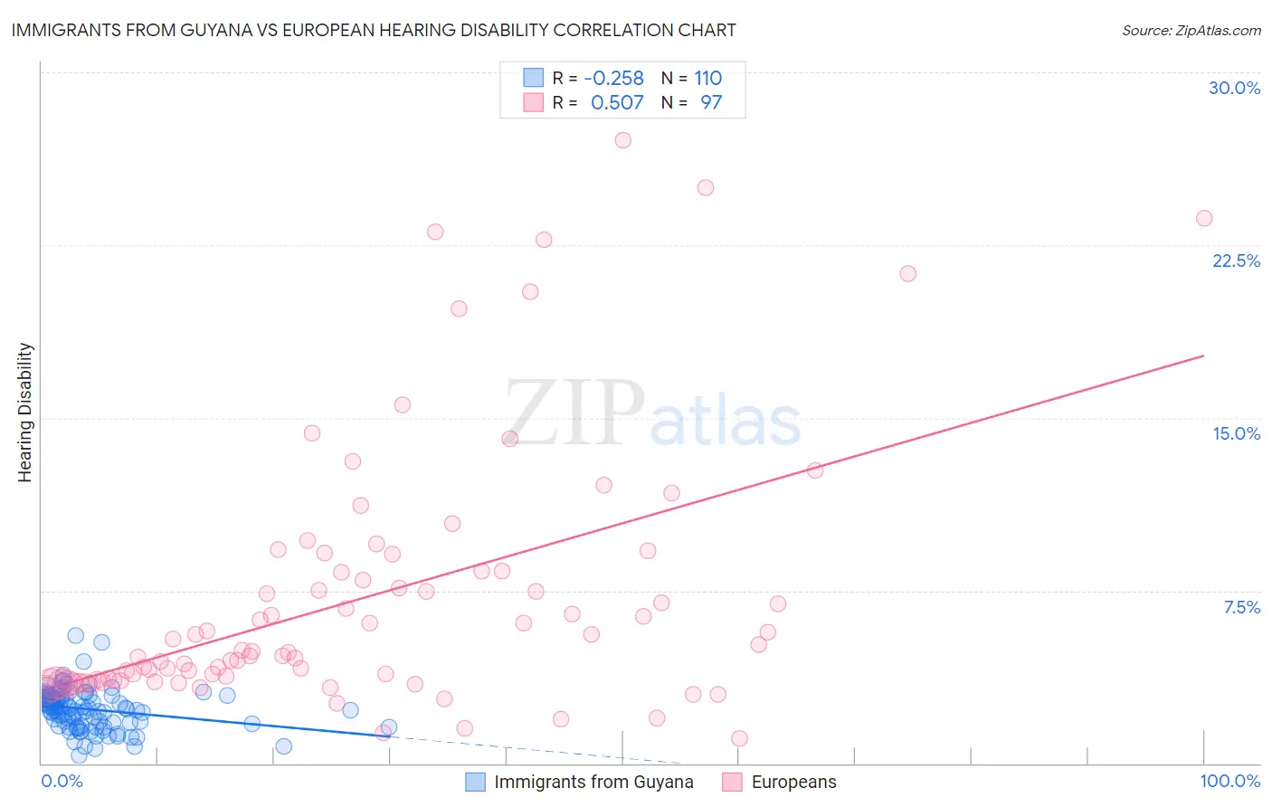Immigrants from Guyana vs European Hearing Disability Correlation Chart