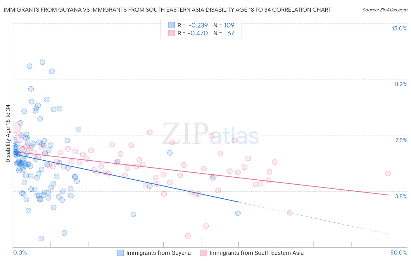 Immigrants from Guyana vs Immigrants from South Eastern Asia Disability Age 18 to 34 Correlation Chart
