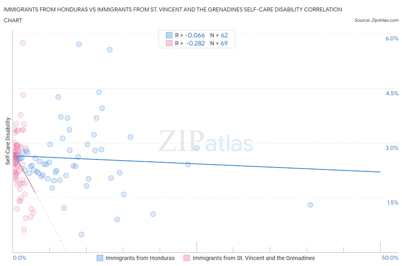 Immigrants from Honduras vs Immigrants from St. Vincent and the Grenadines Self-Care Disability Correlation Chart