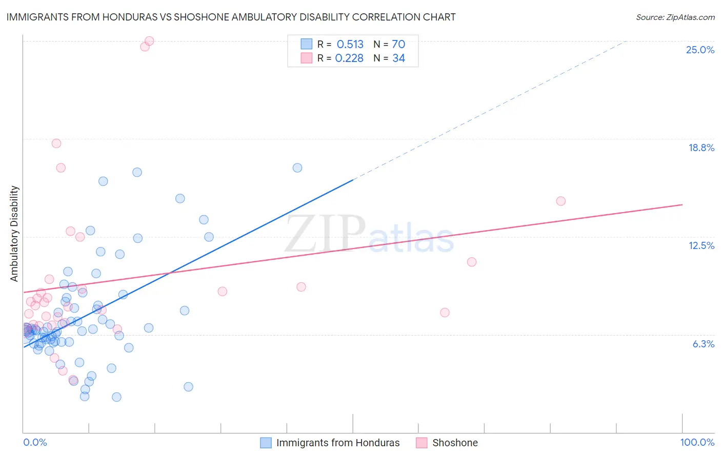 Immigrants from Honduras vs Shoshone Ambulatory Disability Correlation Chart
