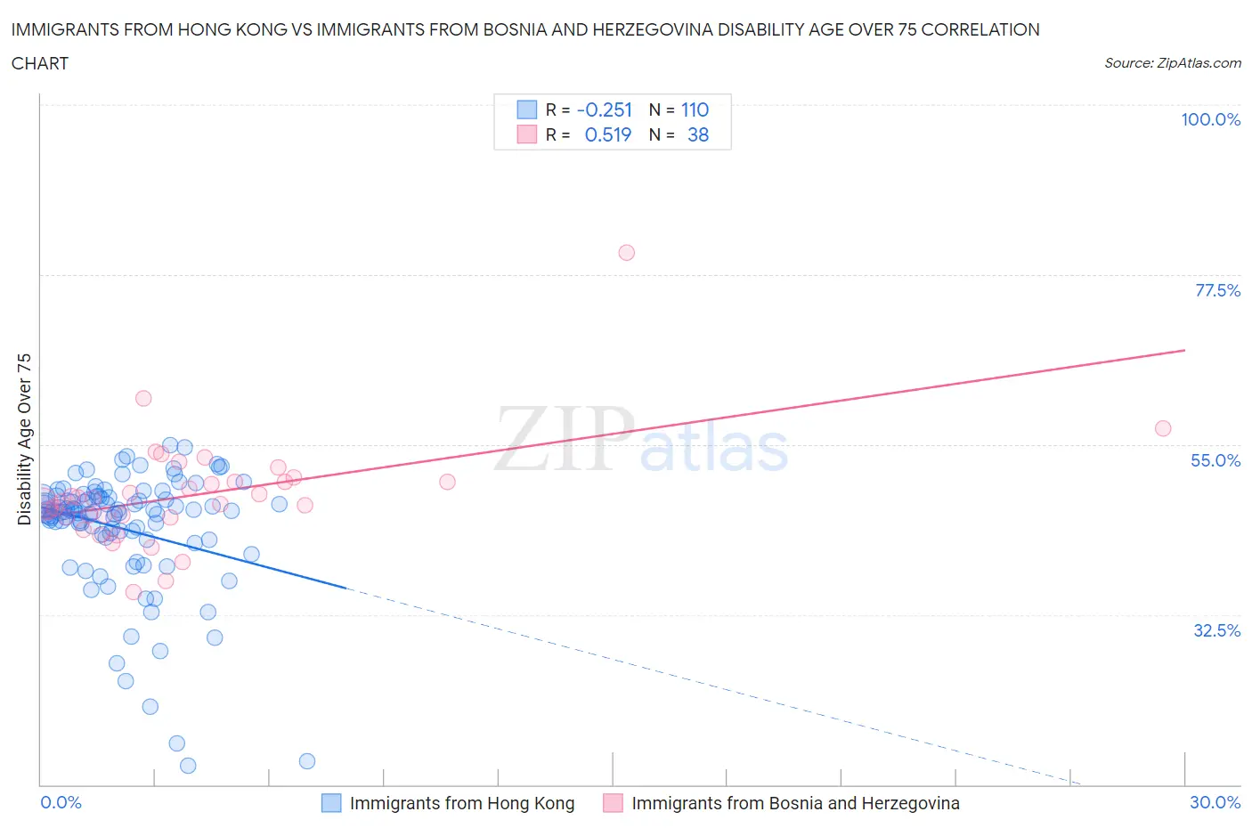 Immigrants from Hong Kong vs Immigrants from Bosnia and Herzegovina Disability Age Over 75 Correlation Chart