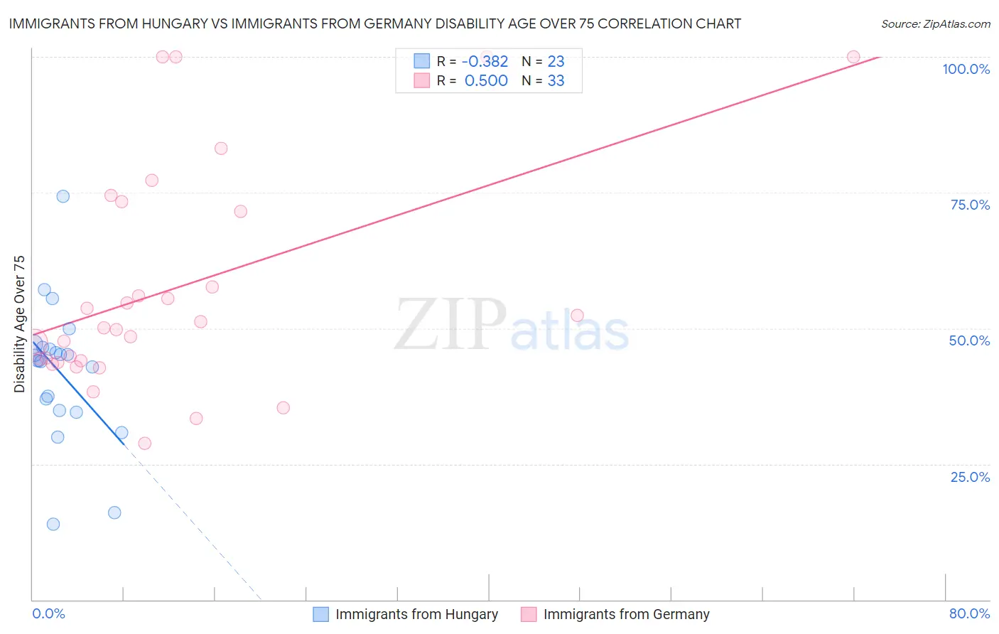 Immigrants from Hungary vs Immigrants from Germany Disability Age Over 75 Correlation Chart