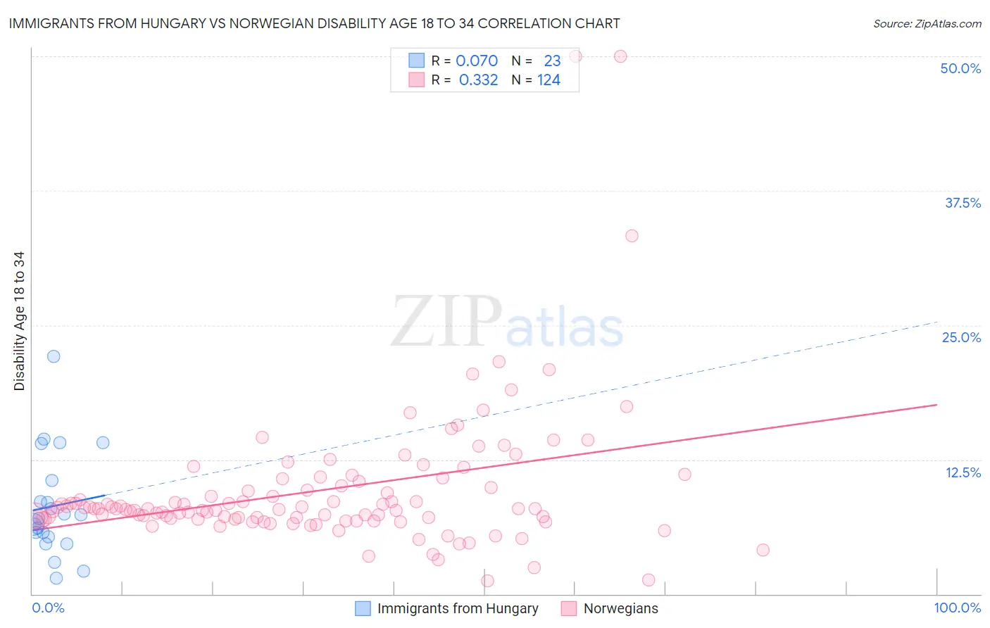 Immigrants from Hungary vs Norwegian Disability Age 18 to 34 Correlation Chart