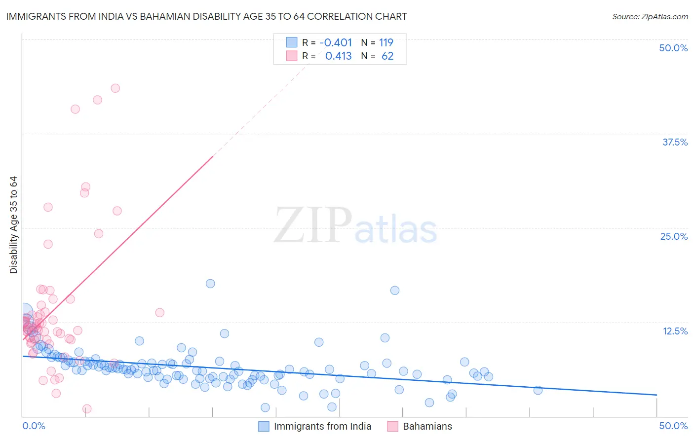 Immigrants from India vs Bahamian Disability Age 35 to 64 Correlation Chart