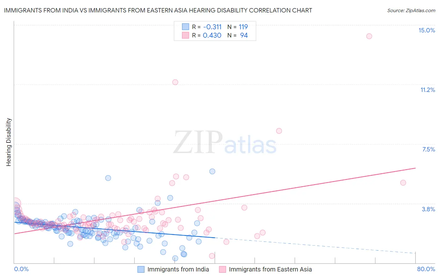 Immigrants from India vs Immigrants from Eastern Asia Hearing Disability Correlation Chart