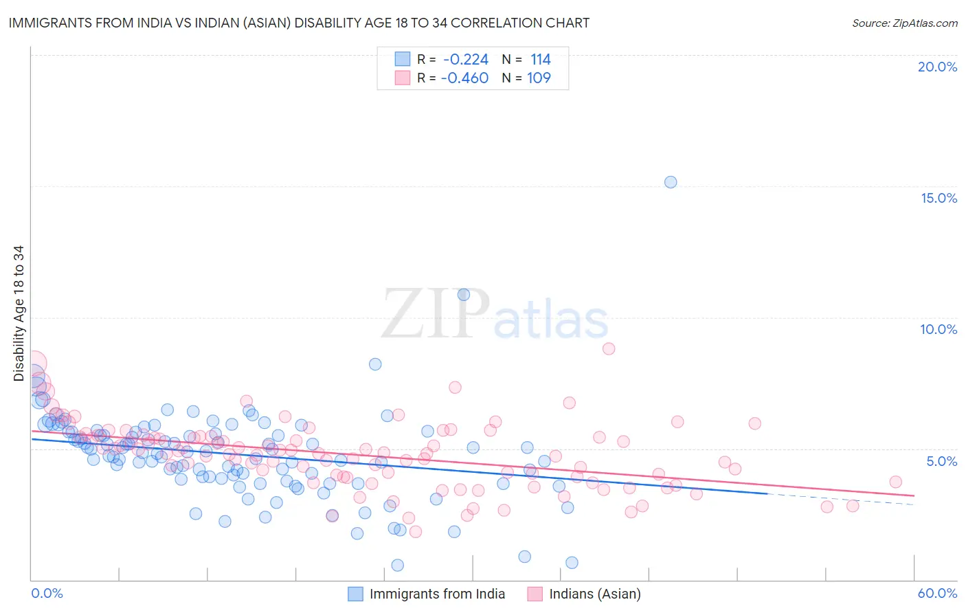 Immigrants from India vs Indian (Asian) Disability Age 18 to 34 Correlation Chart