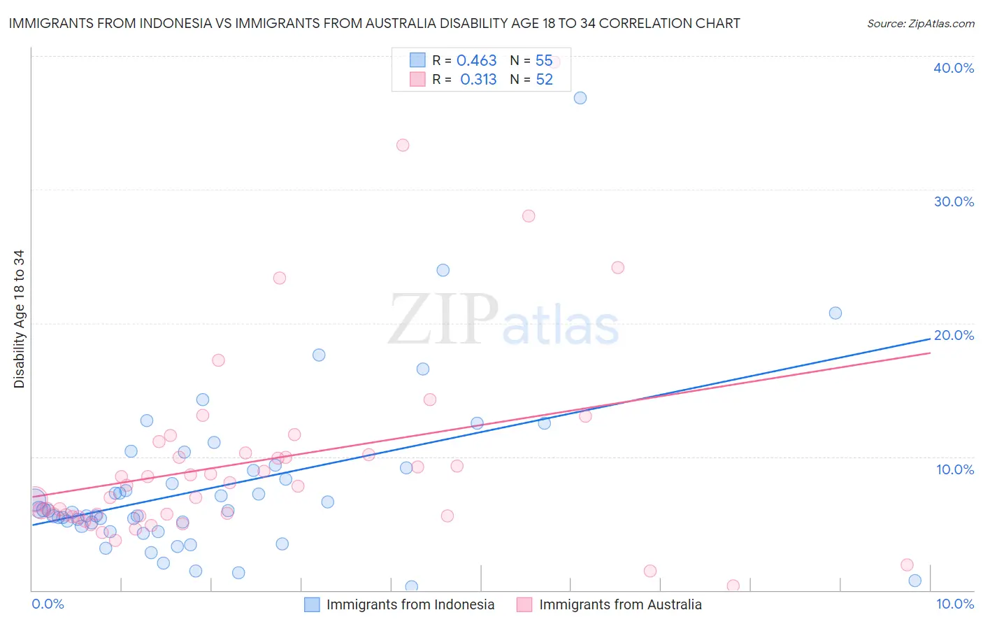 Immigrants from Indonesia vs Immigrants from Australia Disability Age 18 to 34 Correlation Chart