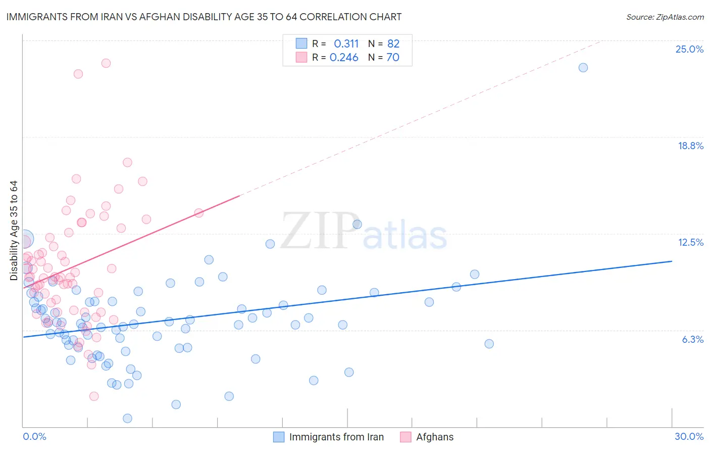 Immigrants from Iran vs Afghan Disability Age 35 to 64 Correlation Chart