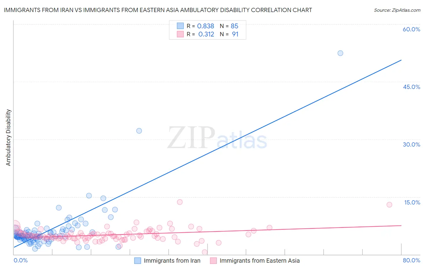 Immigrants from Iran vs Immigrants from Eastern Asia Ambulatory Disability Correlation Chart