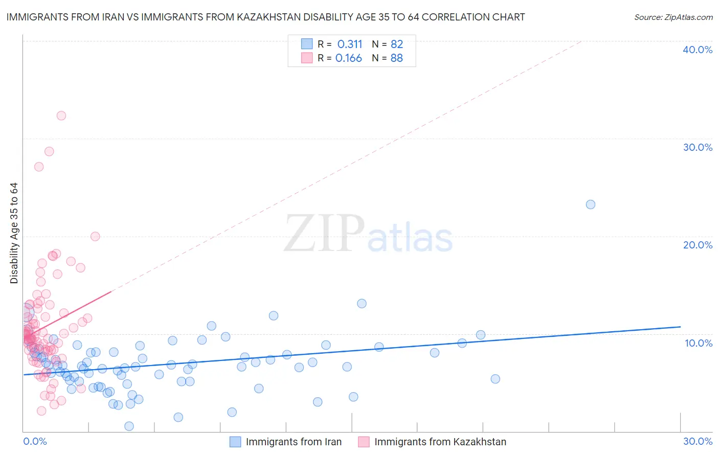 Immigrants from Iran vs Immigrants from Kazakhstan Disability Age 35 to 64 Correlation Chart