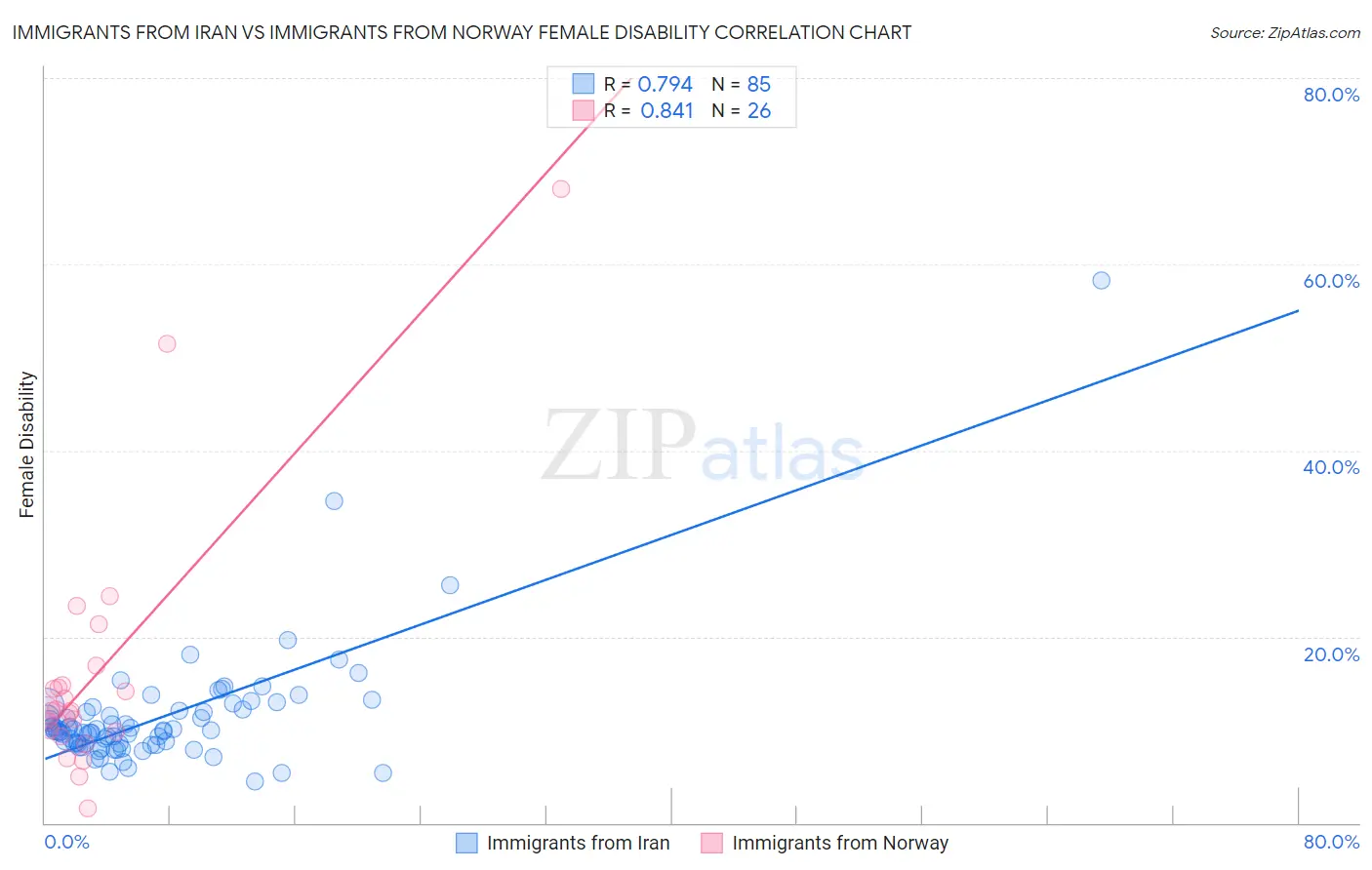 Immigrants from Iran vs Immigrants from Norway Female Disability Correlation Chart