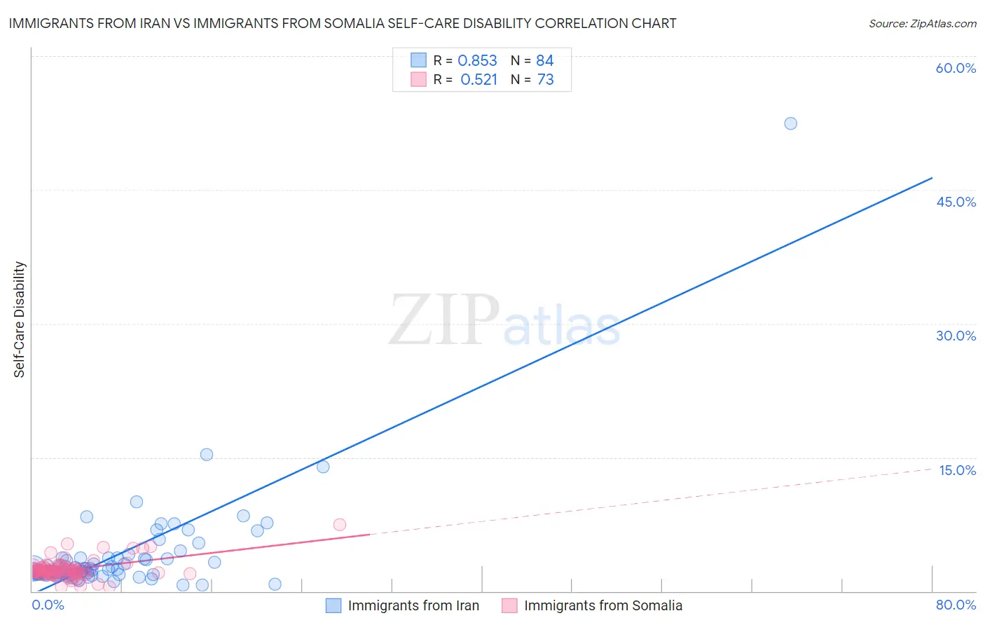 Immigrants from Iran vs Immigrants from Somalia Self-Care Disability Correlation Chart