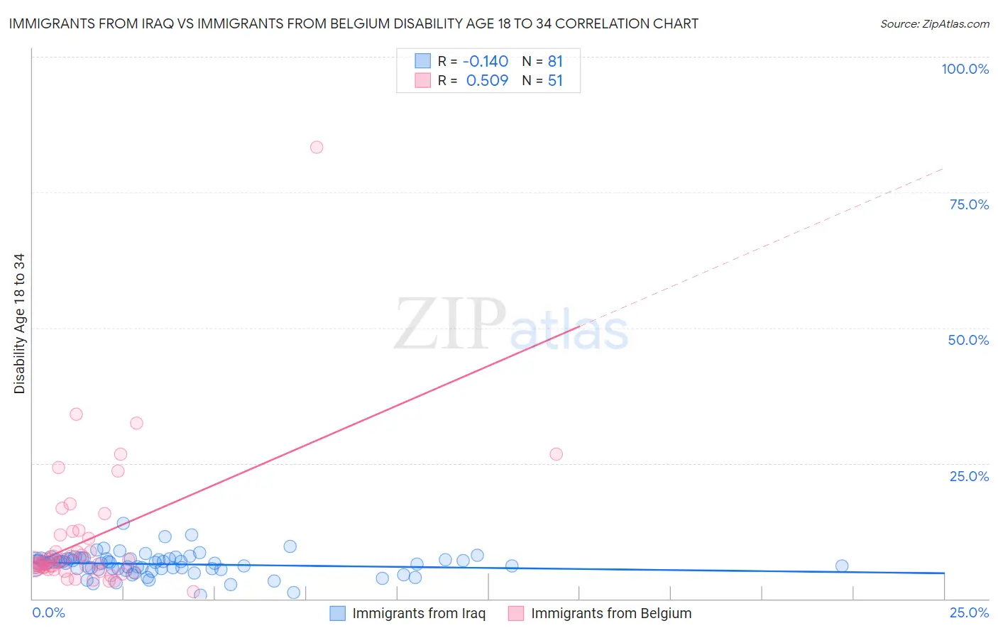 Immigrants from Iraq vs Immigrants from Belgium Disability Age 18 to 34 Correlation Chart