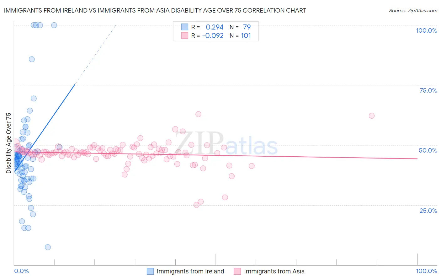 Immigrants from Ireland vs Immigrants from Asia Disability Age Over 75 Correlation Chart