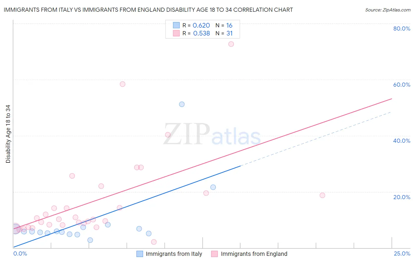 Immigrants from Italy vs Immigrants from England Disability Age 18 to 34 Correlation Chart