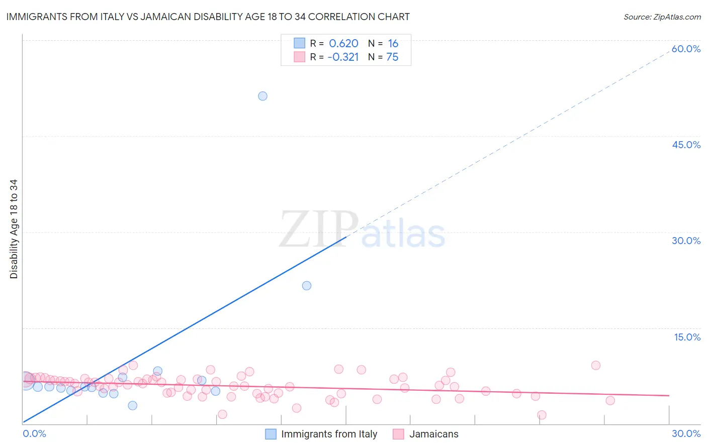 Immigrants from Italy vs Jamaican Disability Age 18 to 34 Correlation Chart