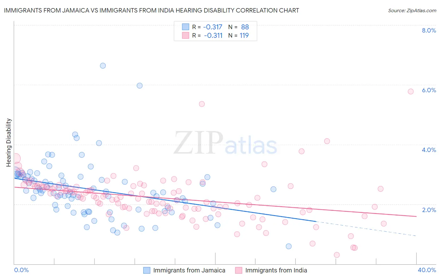 Immigrants from Jamaica vs Immigrants from India Hearing Disability Correlation Chart