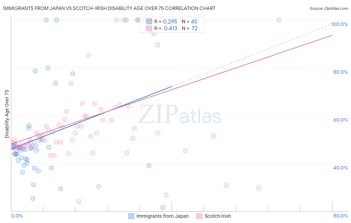 Immigrants from Japan vs Scotch-Irish Disability Age Over 75 Correlation Chart
