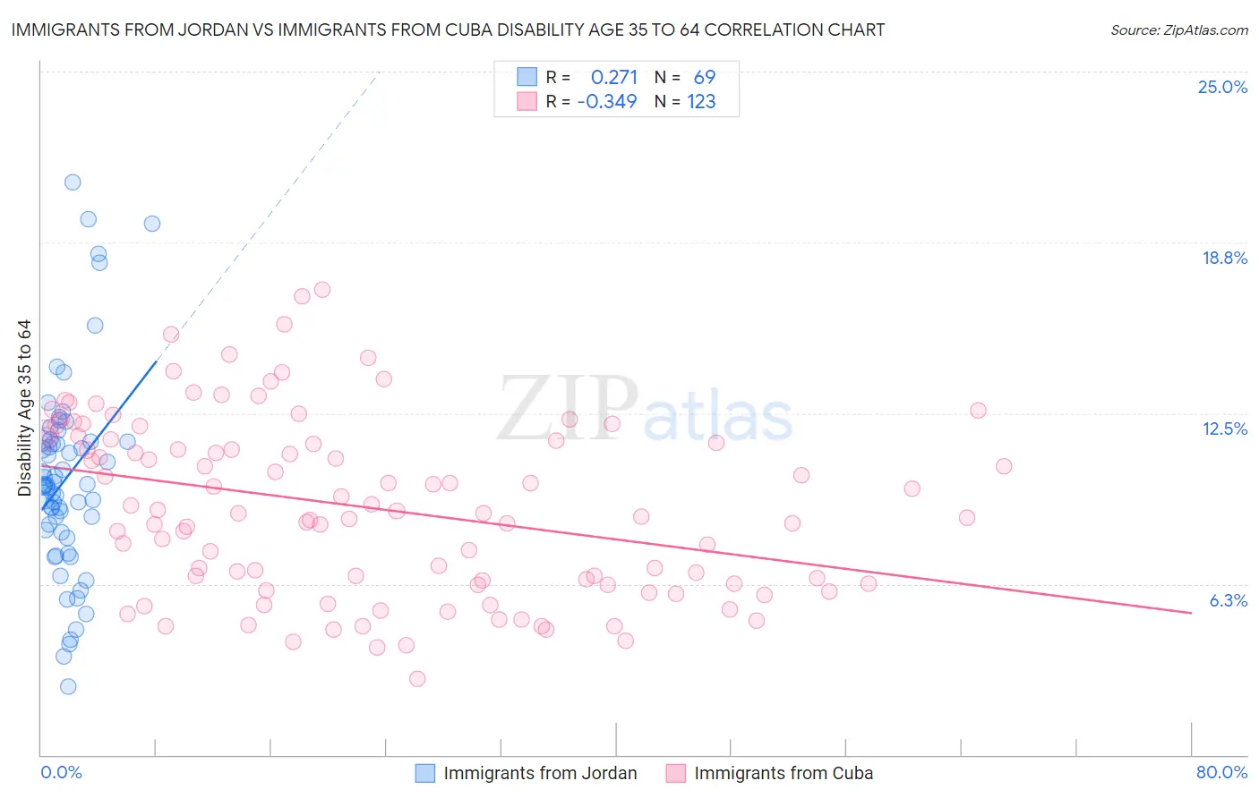Immigrants from Jordan vs Immigrants from Cuba Disability Age 35 to 64 Correlation Chart