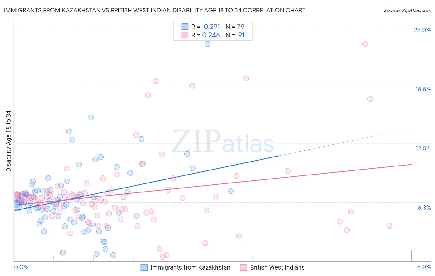 Immigrants from Kazakhstan vs British West Indian Disability Age 18 to 34 Correlation Chart