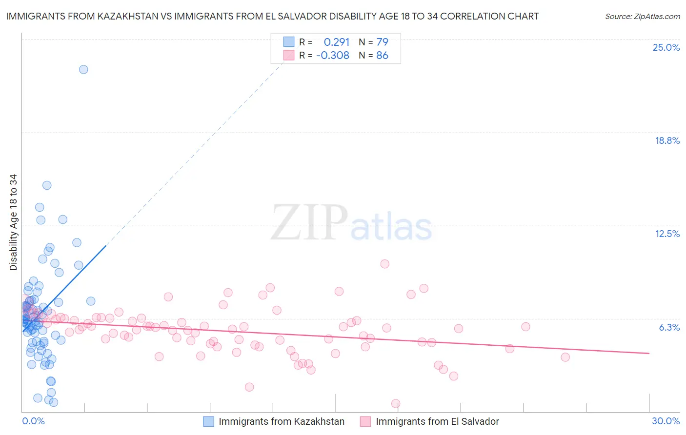Immigrants from Kazakhstan vs Immigrants from El Salvador Disability Age 18 to 34 Correlation Chart