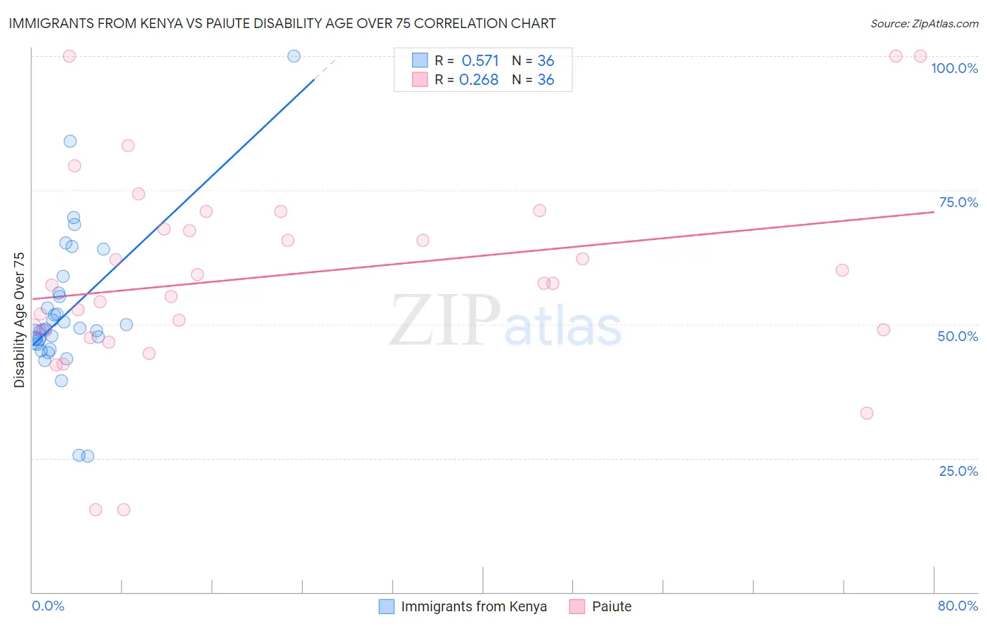 Immigrants from Kenya vs Paiute Disability Age Over 75 Correlation Chart